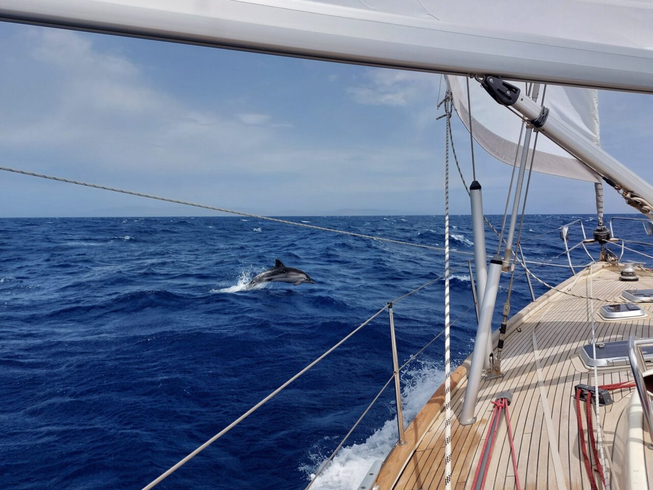 Der er meldt sydlig vind, så vi går for sejl op til Halkidiki i Nord (området med de 3 fingre). Vi ankommer til den midterste finger, Sithonia og bliver vel modtaget af en stor flok delfiner, der laver opvisning med høje spring i over 1/2 time – så imponerende!